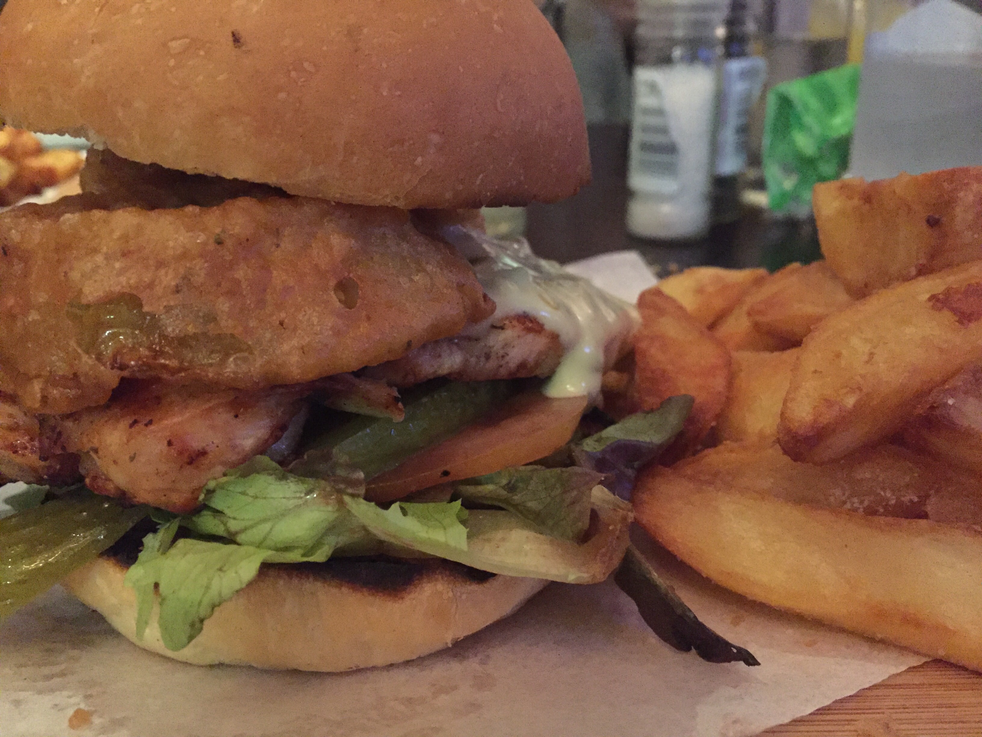Norm had a blue cheese and onion burger from the specials board and I had the Cajun Chicken Burger at R82.