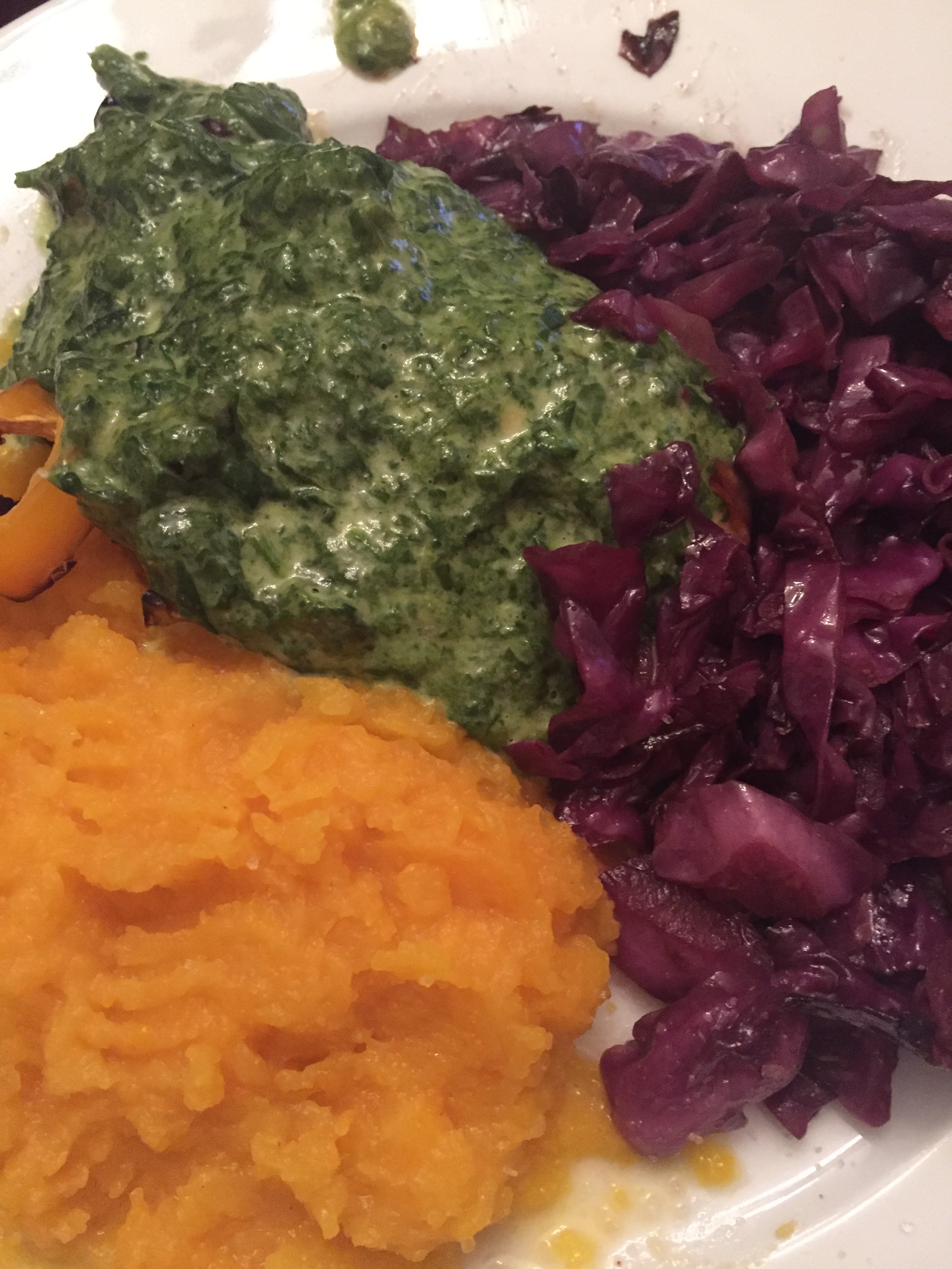 On Thursday when I got home from work Norm was out walking the dogs and it was really cold so I started a fire and got dinner on the go. I had gem squash, chicken breasts, baby spinach and red cabbage to work with so I decided to bake the chicken with sliced peppers and a bit of coconut oil. I sliced the cabbage and fried it in butter and balsamic vinegar. I steamed the gem squash. I stir fried the baby spinach in a tiny bit of butter until it was limp then used the hand blender to puree it and then stirred in a dollop of double cream and a handful of grated mature cheddar cheese and simmered until it was all melted. I topped the baked chicken with the spinach mix and scooped out the squash and mashed with butter to serve it. It was so delicious even if it looks a bit of a mess.