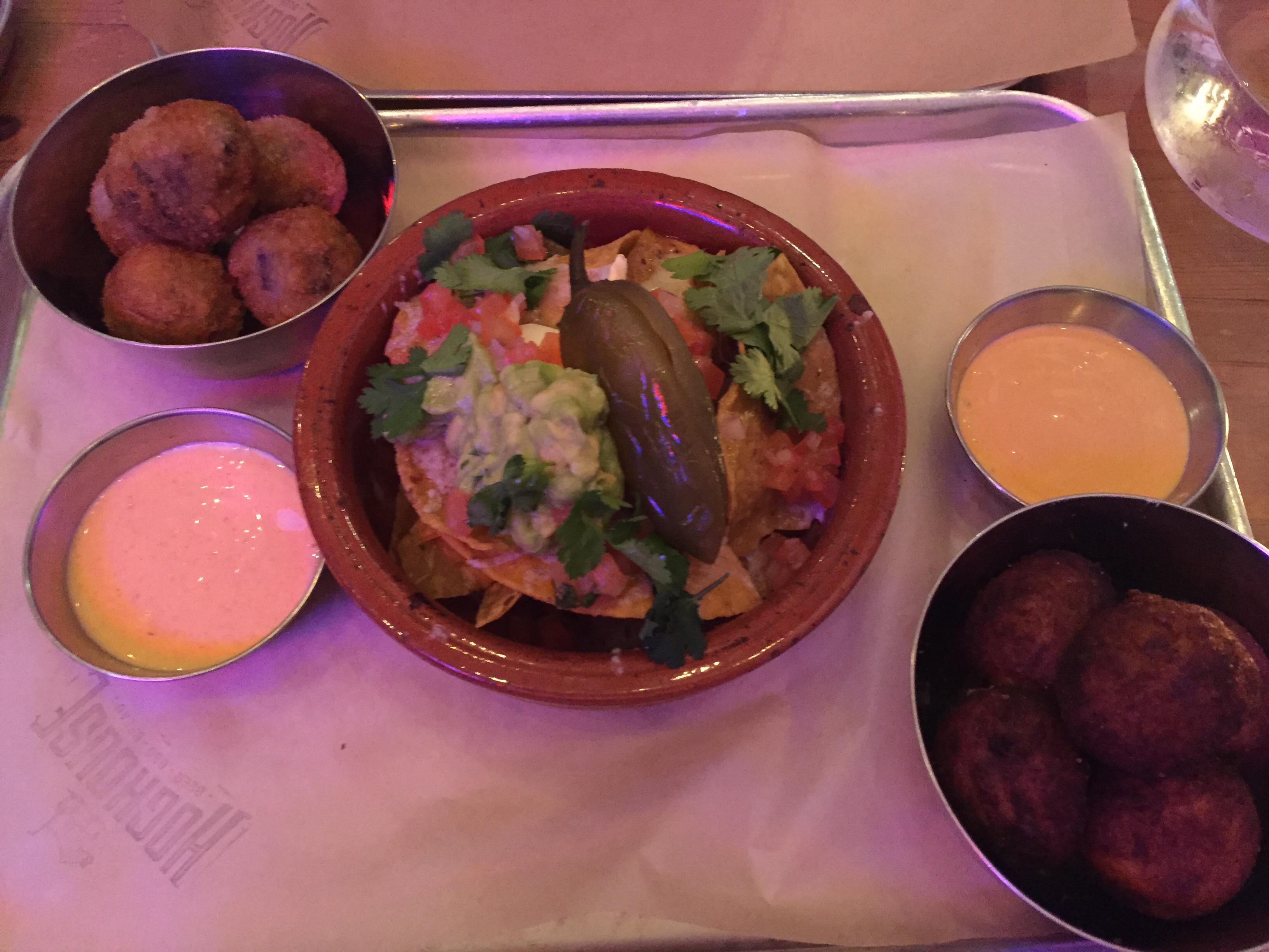 We also ordered a portion each of the Arancini, the croquettes and some nachos. The arancini is balls of wild mushroom risotto served with chipotle aioli. They are gorgeous. The croquettes were described as ‘bacon + boerenkaas / kimchi aioli’. They were crispy, cheesy and bacony, exactly as you would expect. I love a good croquette.