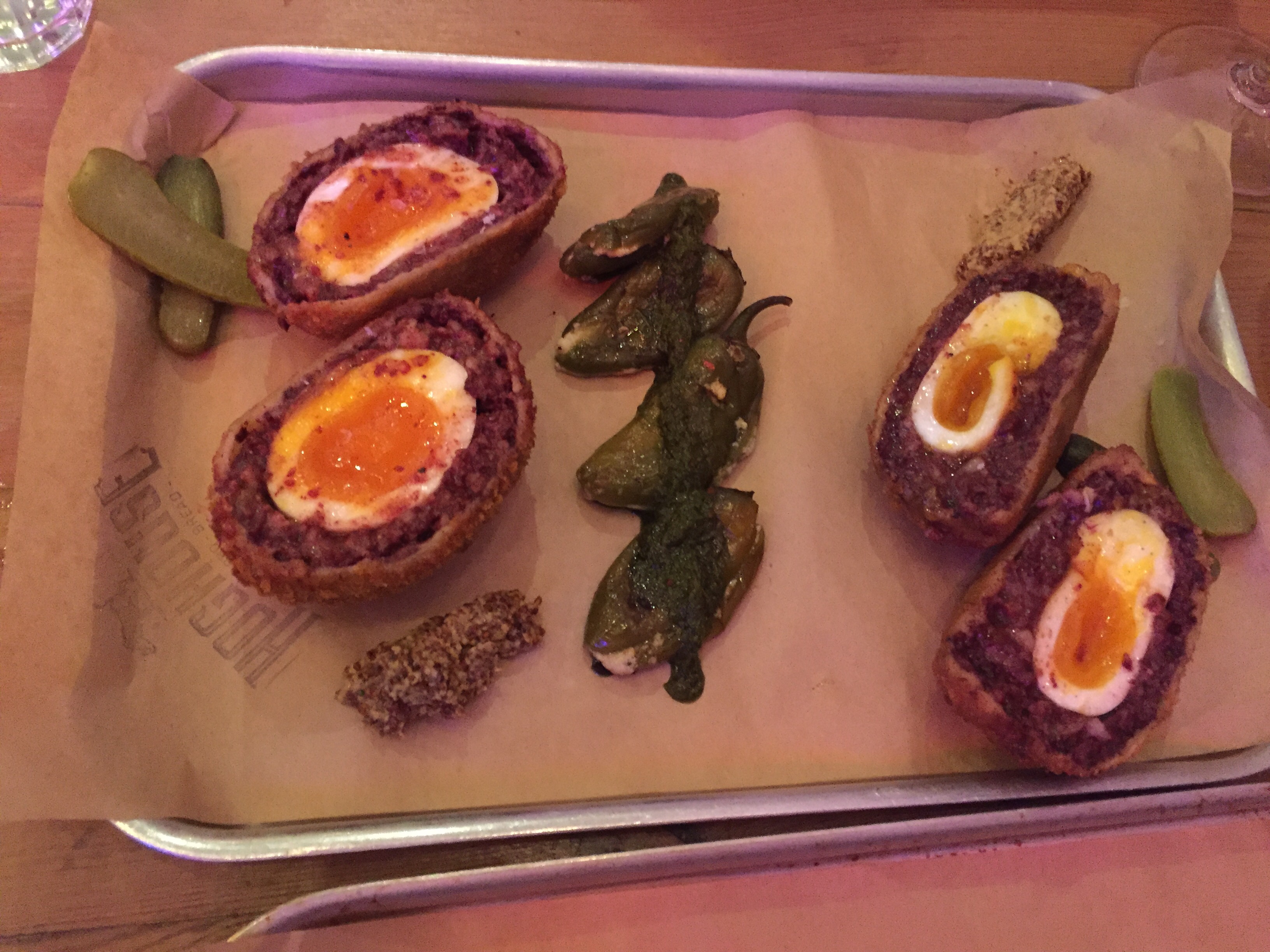 The fellas were salivating over the thought of Scotch eggs so we ordered 2 portions of those for them and some chili poppers. None of us enjoyed the chill poppers – they are served more like what I am used to a chill relleno being prepared but they used jalapenos instead of the traditional poblano chiles, so it was sort of in the middle of these 2 dishes.