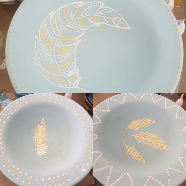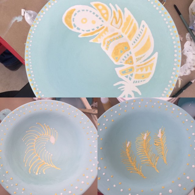 The top plate is a pic of Lily’s and the bottom 2 are mine. I chose 3 feathers in one of the plates I painted. This was to represent me and my 2 mini-me daughters. And yes I know those feathers look more like fish bones than feathers. Like many things, I love to paint but have rubbish skills.