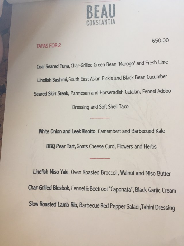 The way it works is that you pair up for Tapas for Two for R650 for the full menu. The Menu for Saturday is below, it changes depending on what is fresh and available locally but you cannot make choices – you get what is on the menu.