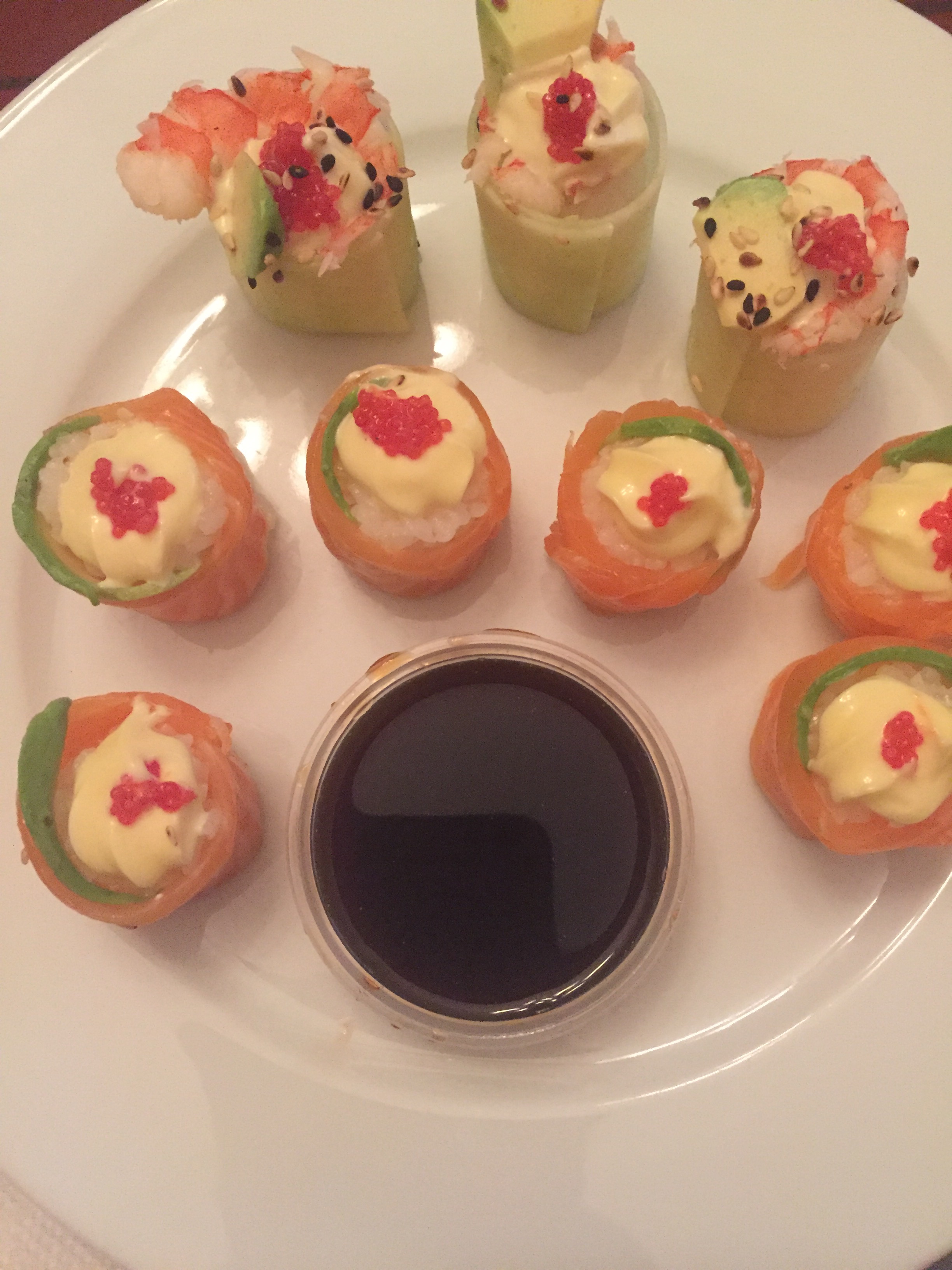 It was fresh and lovely. I had salmon roses (as always) and bamboo rolls topped with prawn.
