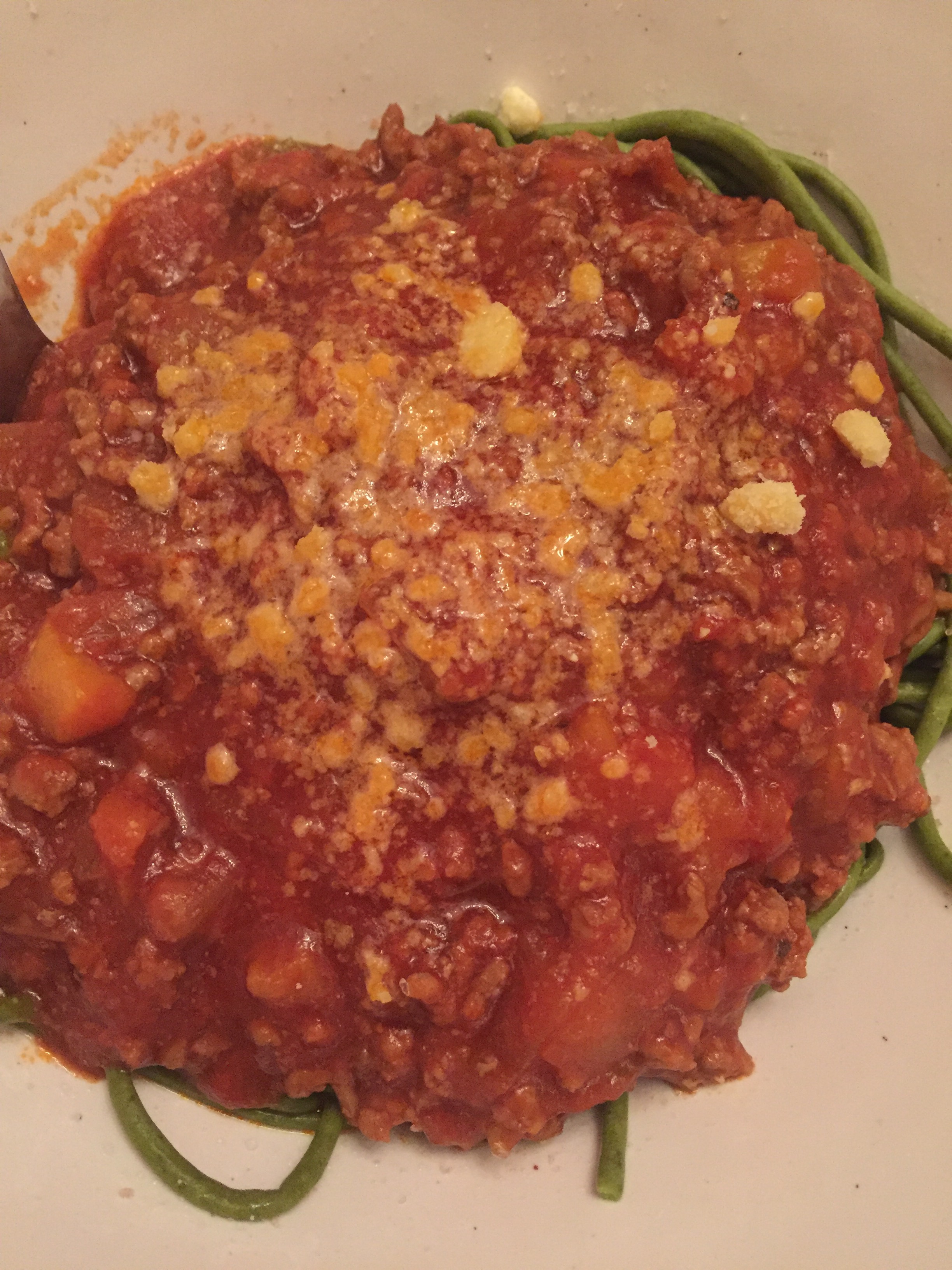 Dinner tonight was ‘noodles’ made out of spinach topped with bolognaise. All low carb, high fat.