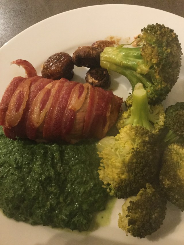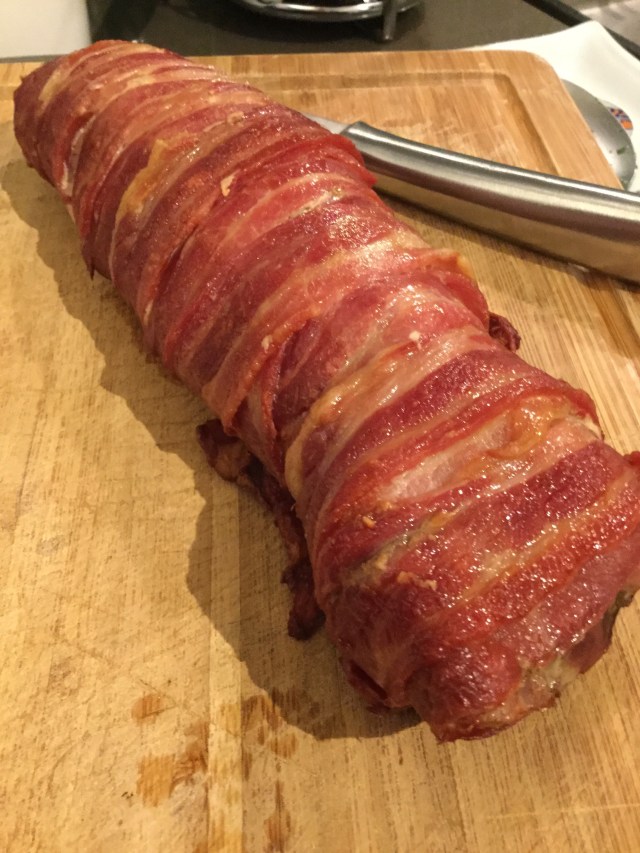 That night Norm was home late so I had to conjure up something for dinner out of what was in the fridge. We had a small pork fillet and some bacon so I wrapped the fillet in bacon and baked it in a pan with some mushrooms.