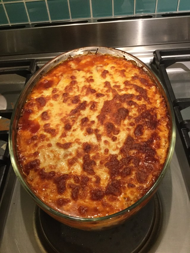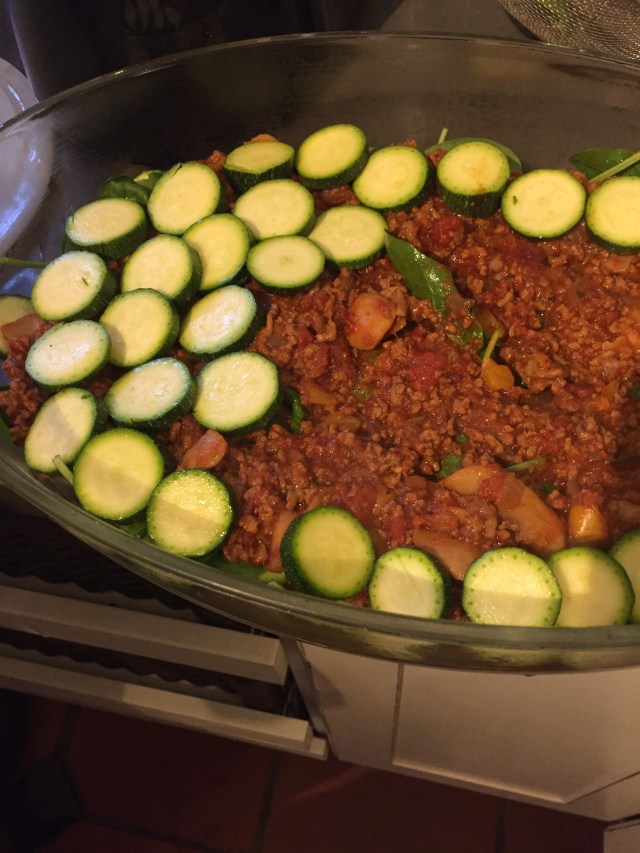 He chopped zucchini and layered those and raw baby spinach with the sauce, then topped it all with mozzarella.