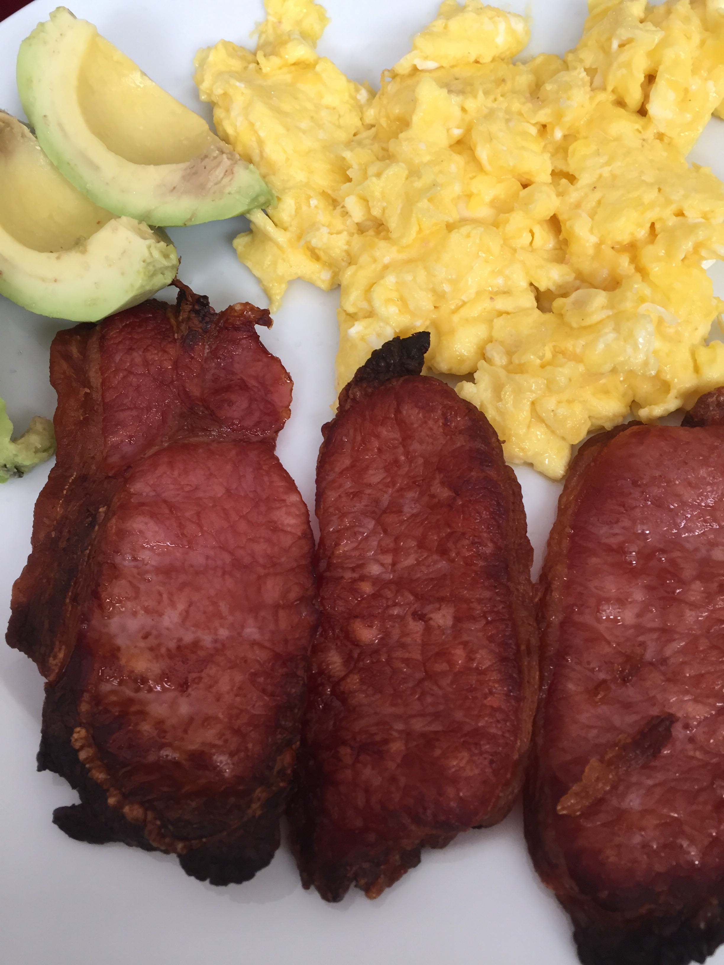 Back to Saturday morning, Norm and I finally got up as we were getting pretty hungry and while I was off foraging for an easy yogurt, he offered to make us a healthy low carb, high fat breakfast. He made crisp bacon, cheesy scrambled eggs and cut up some avo for us.