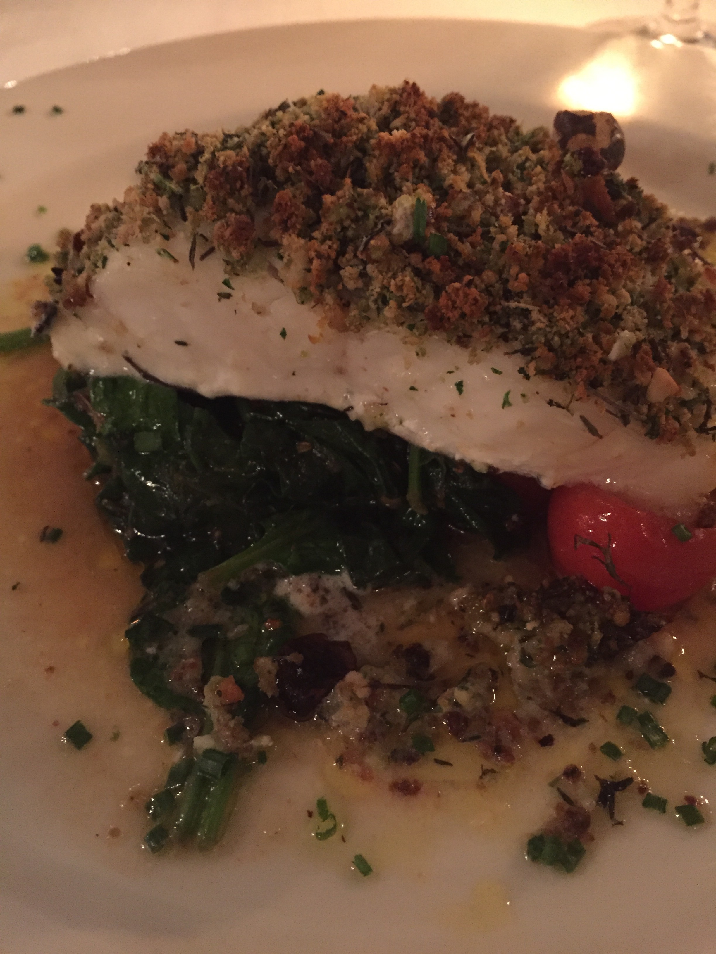 It was a lovely large moist piece of fish and I enjoyed the tasty simplicity of the spinach and tomatoes. I will try out this dish myself I think! They overdid it a tiny bit with the crust – there were dried herbs in the topping which made you think you had a fish bone and once you managed to extract it you found it to be a wee green stick of some sort. But everyone who knows me is aware of my aversion to dried herbs.