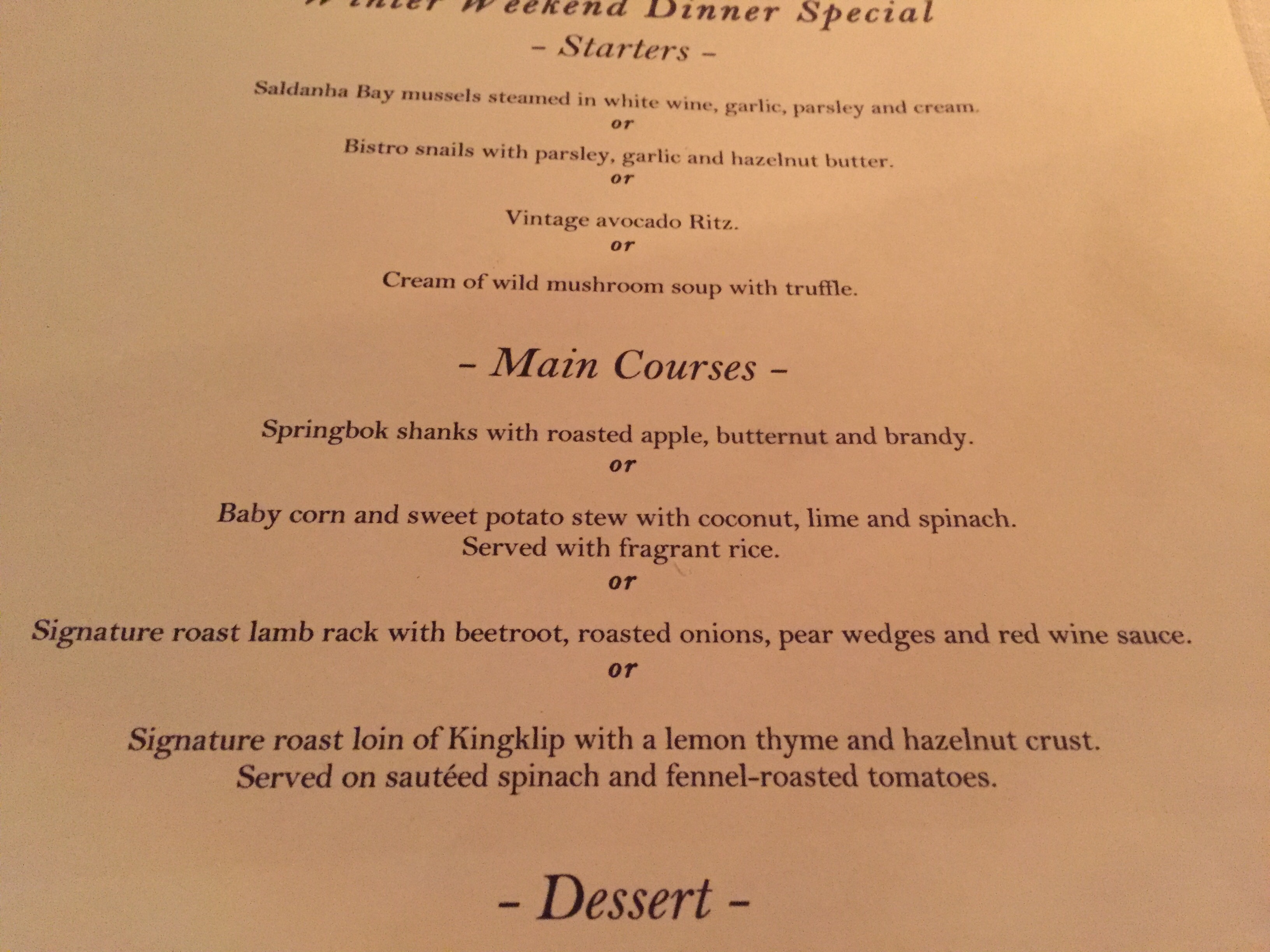 The Winter Special is R195 per person for 3 courses. We had 4 choices to choose from his available starters.
