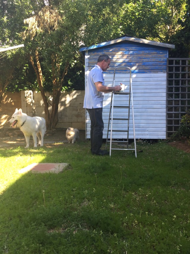 The blue paint is peeling and he’s busy trying to make things more appealing for the upcoming show day.