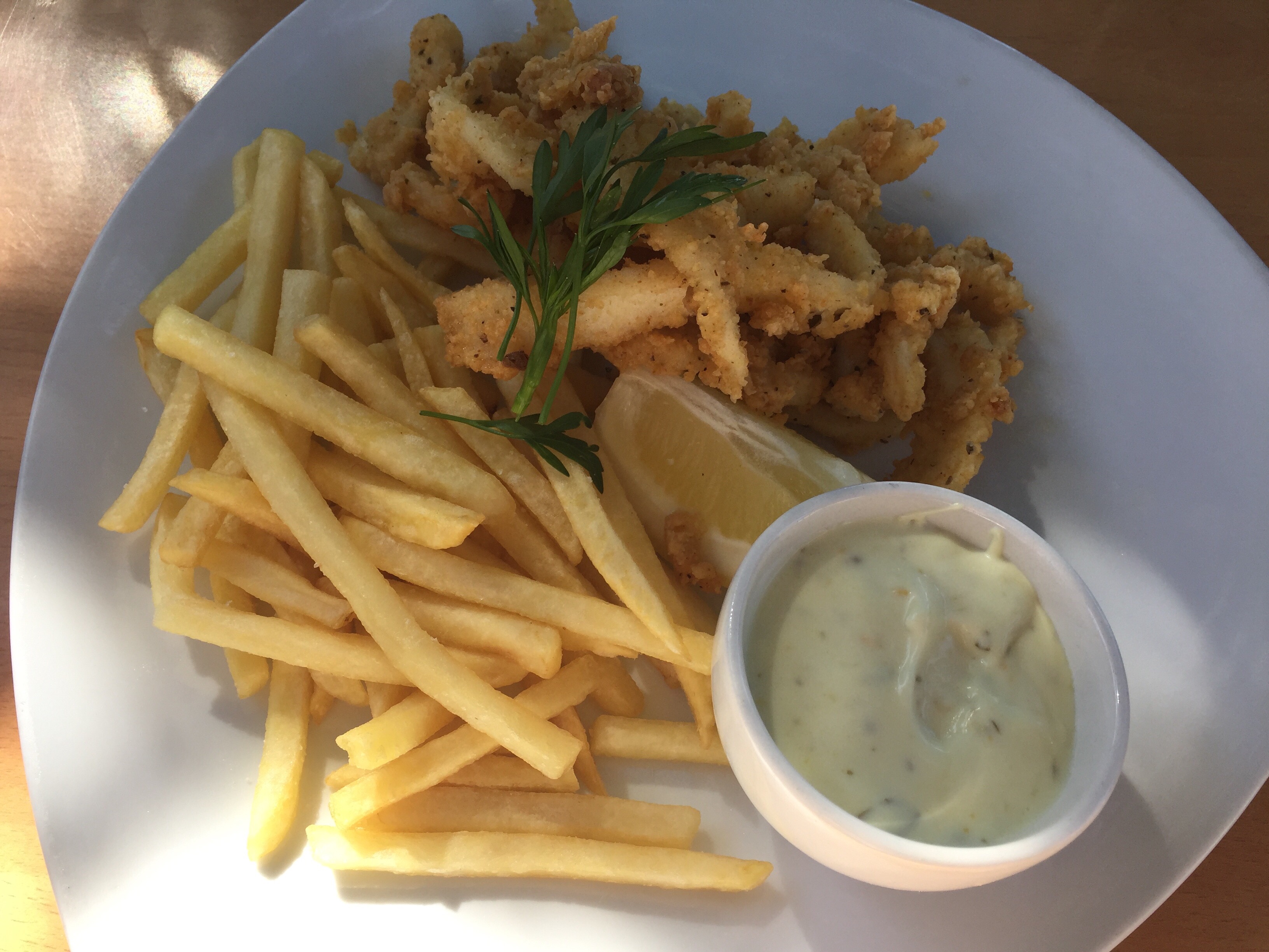 I thought the plan through and ordered something easy to manage with one hand. I had the calamari and chips.