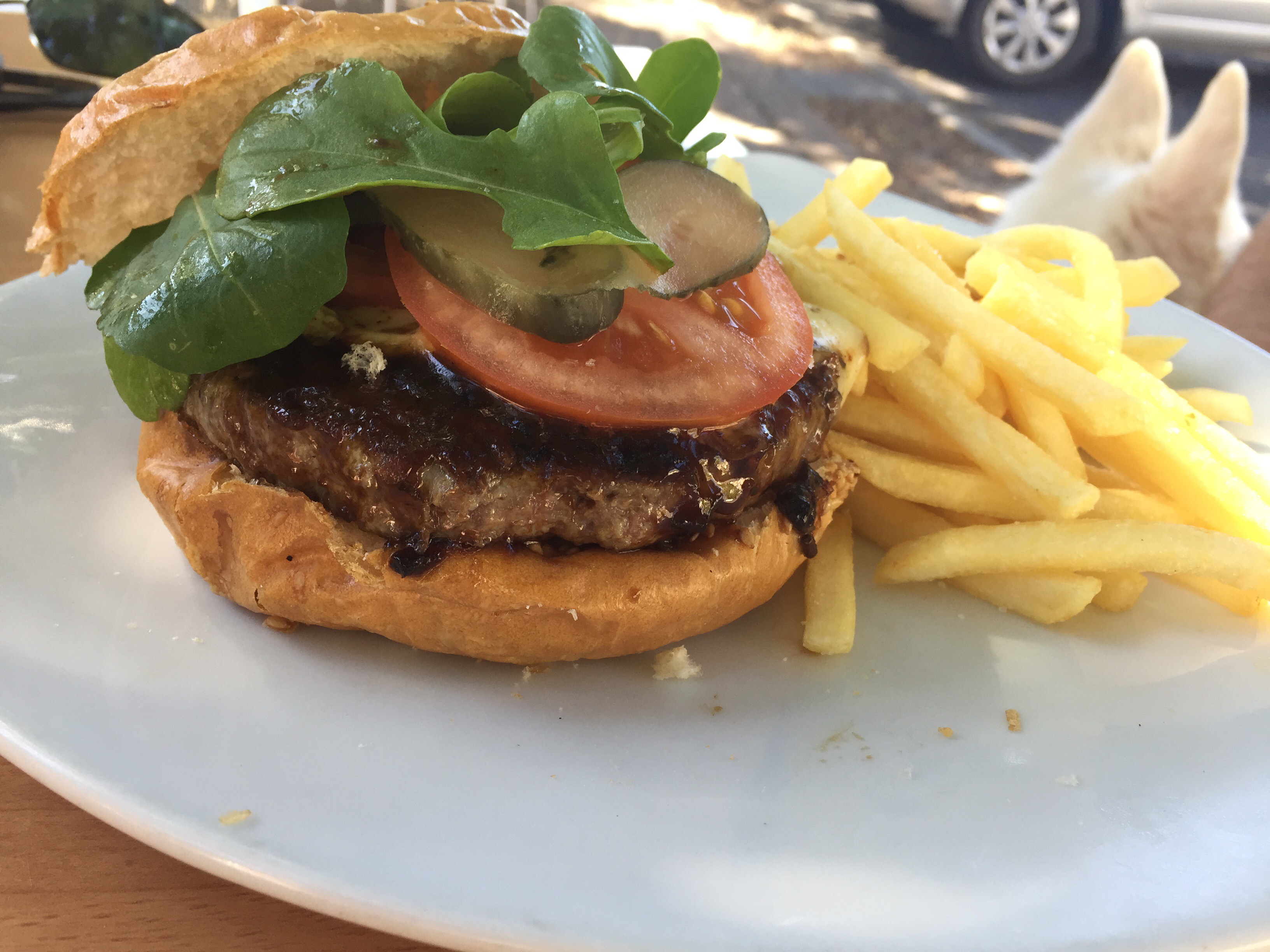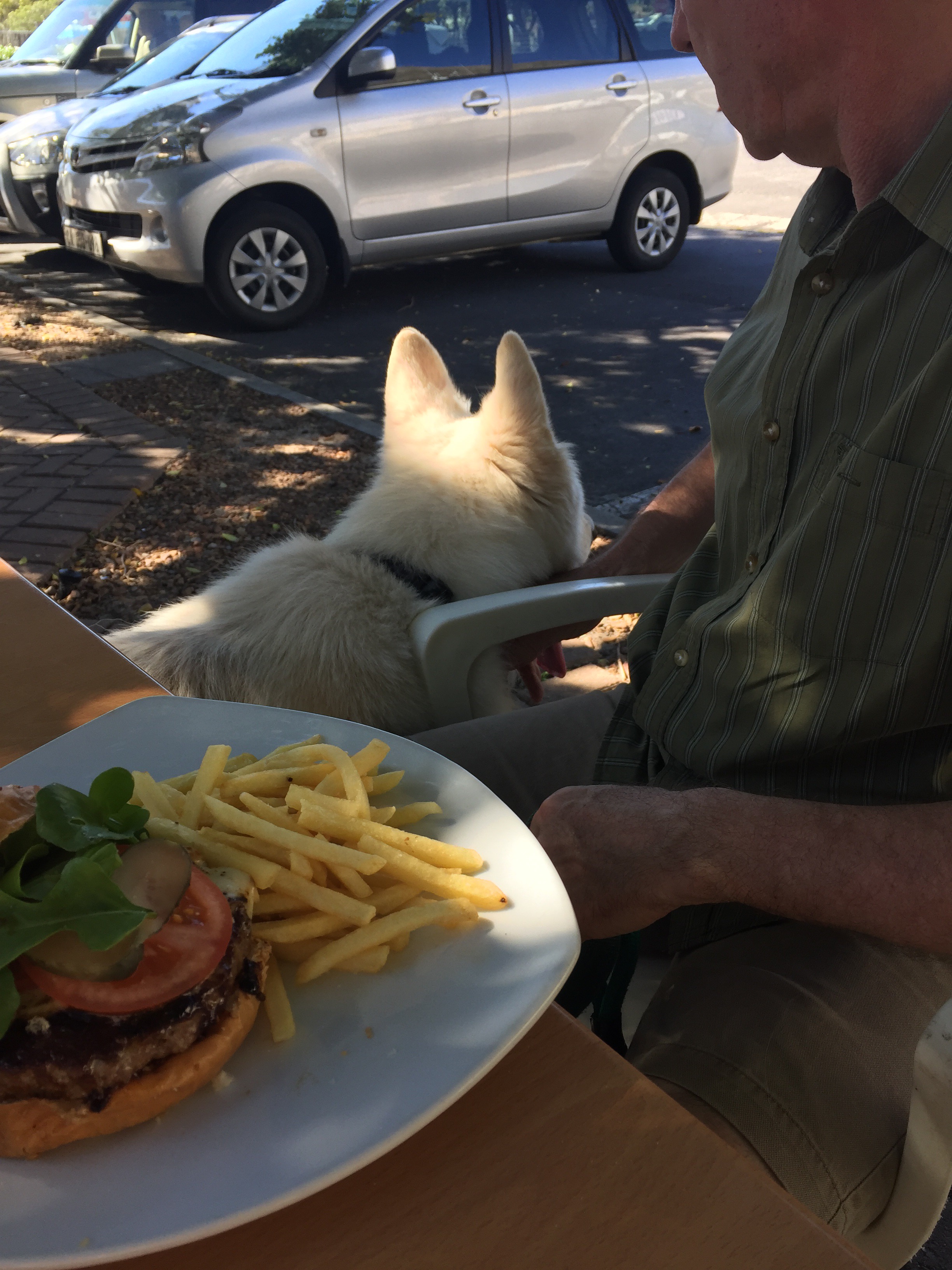 Norm had a burger and fries and somehow managed to eat this with one hand while the other was busy trying to keep Navajo from chasing kids on bikes who were riding past en-route to the beach.