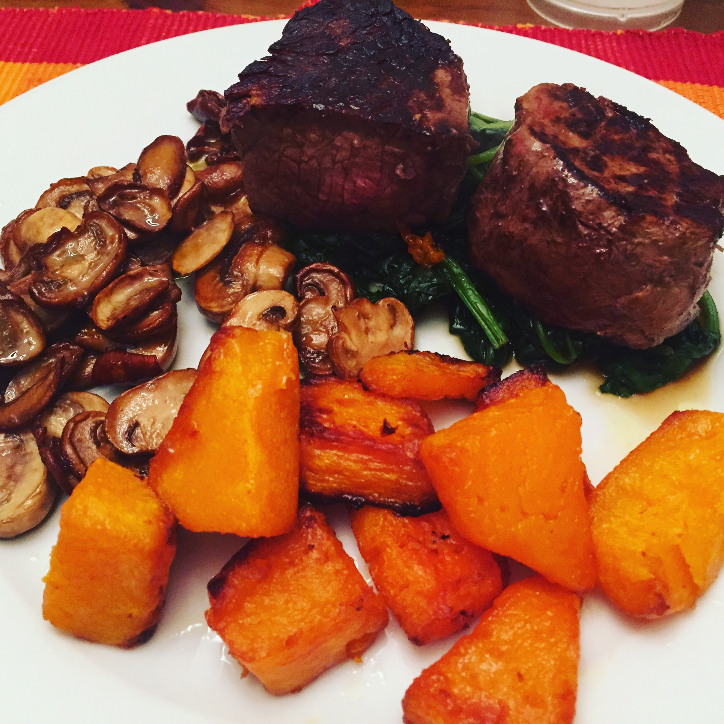 I had such a stressful day on Tuesday that Norm spoiled us with fillet steaks, fried mushrooms, stir fried spinach and roast butternut. It was so divine.