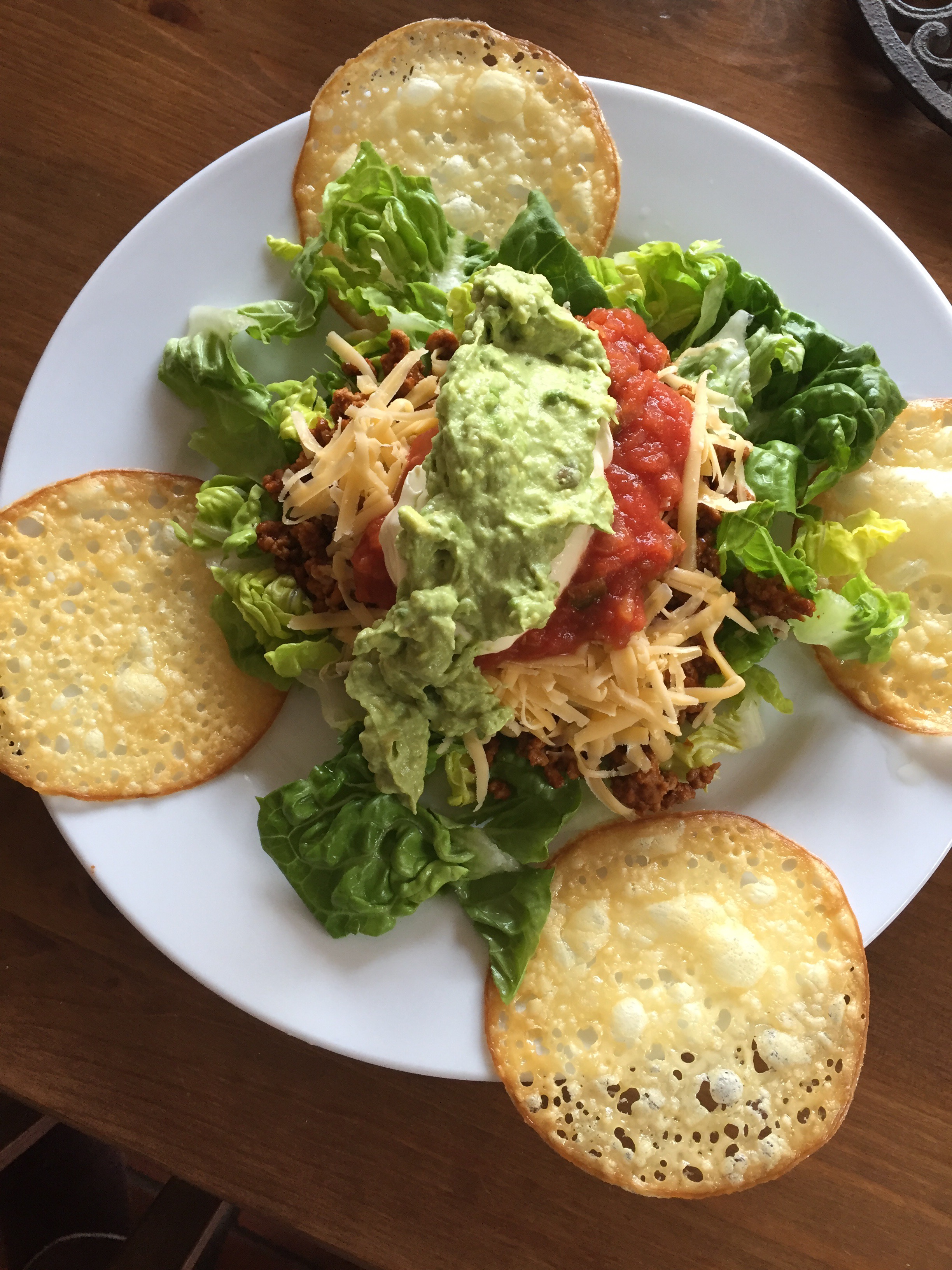 I cooked Mexican food on Wednesday night and kept it low carb. I made proper crispy corn shells for Josh but did provolone cheesy crisps for Norm and I. We had ours as a spicy mexican salad.