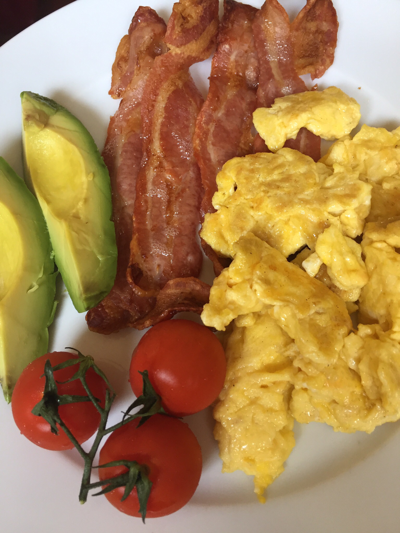 Eventually hunger drove us out of bed and Norm made us a low carb breakfast of streaky bacon, cheesy scrambled eggs, avocado & tomatoes.