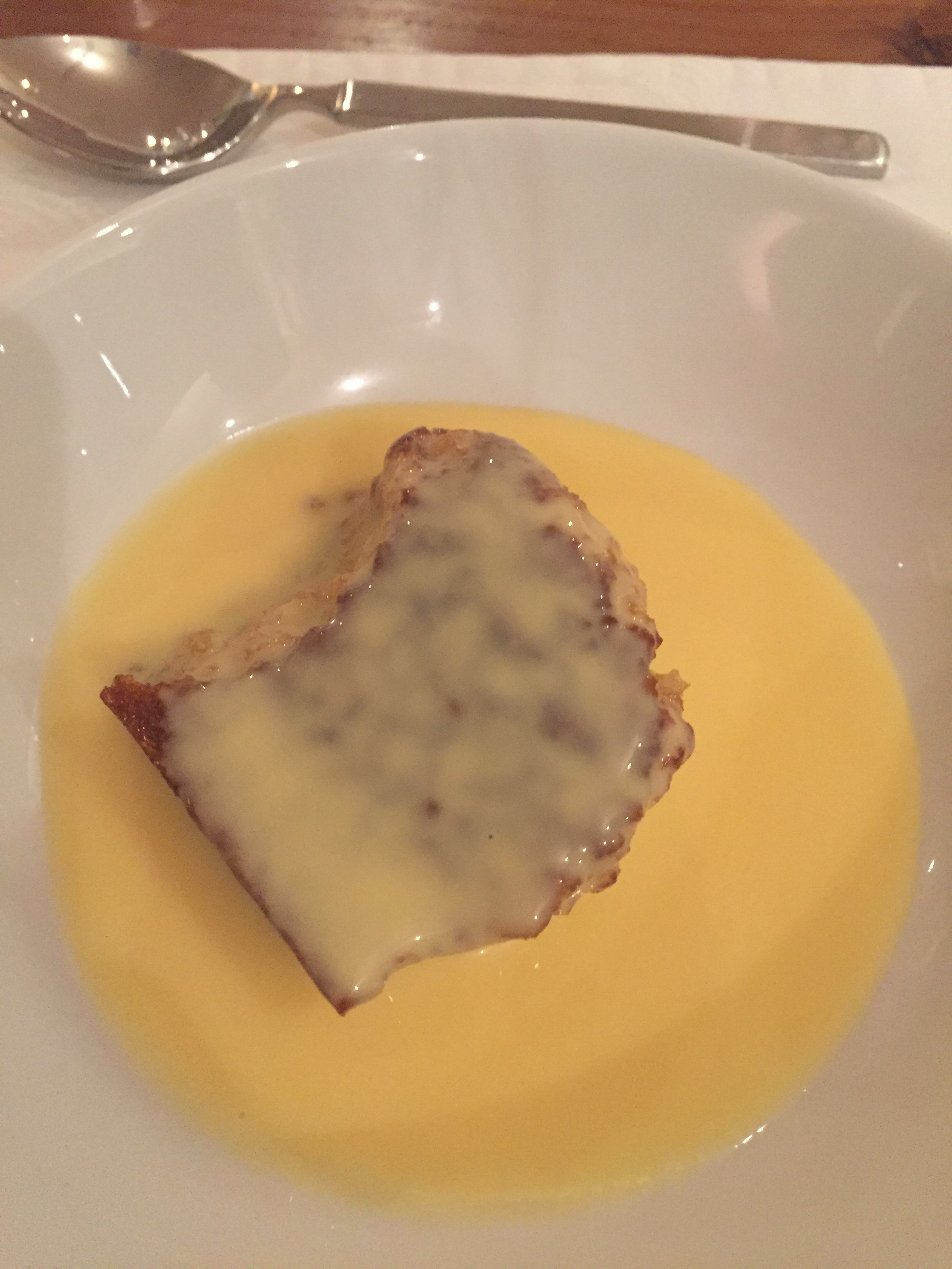 For the main we were told Venison pie was on the menu and as I am not a huge fan of venison or pie, I was feeling a wee bit of trepidation. However this was one very special pie! The venison was tasty and full of rich flavour, but it wasn’t a gamey taste. The pastry was crisp, light and dry and not at all soggy. It was served with oven roasted veg.