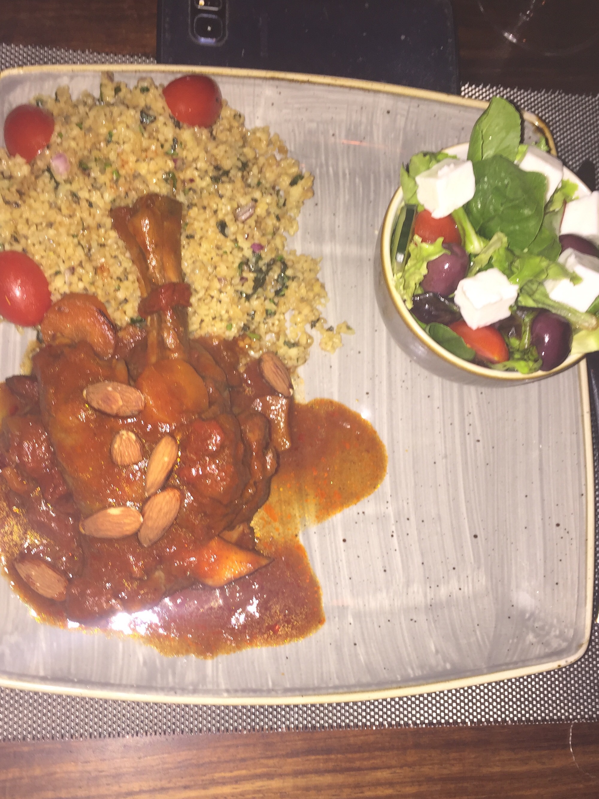 Norm decided to go for the Moroccan Lamb Shank for his main. It was R175 and was described as ‘Slow Roasted for hours in North African spices, served with tabbouleh, almonds & Greek salad.’