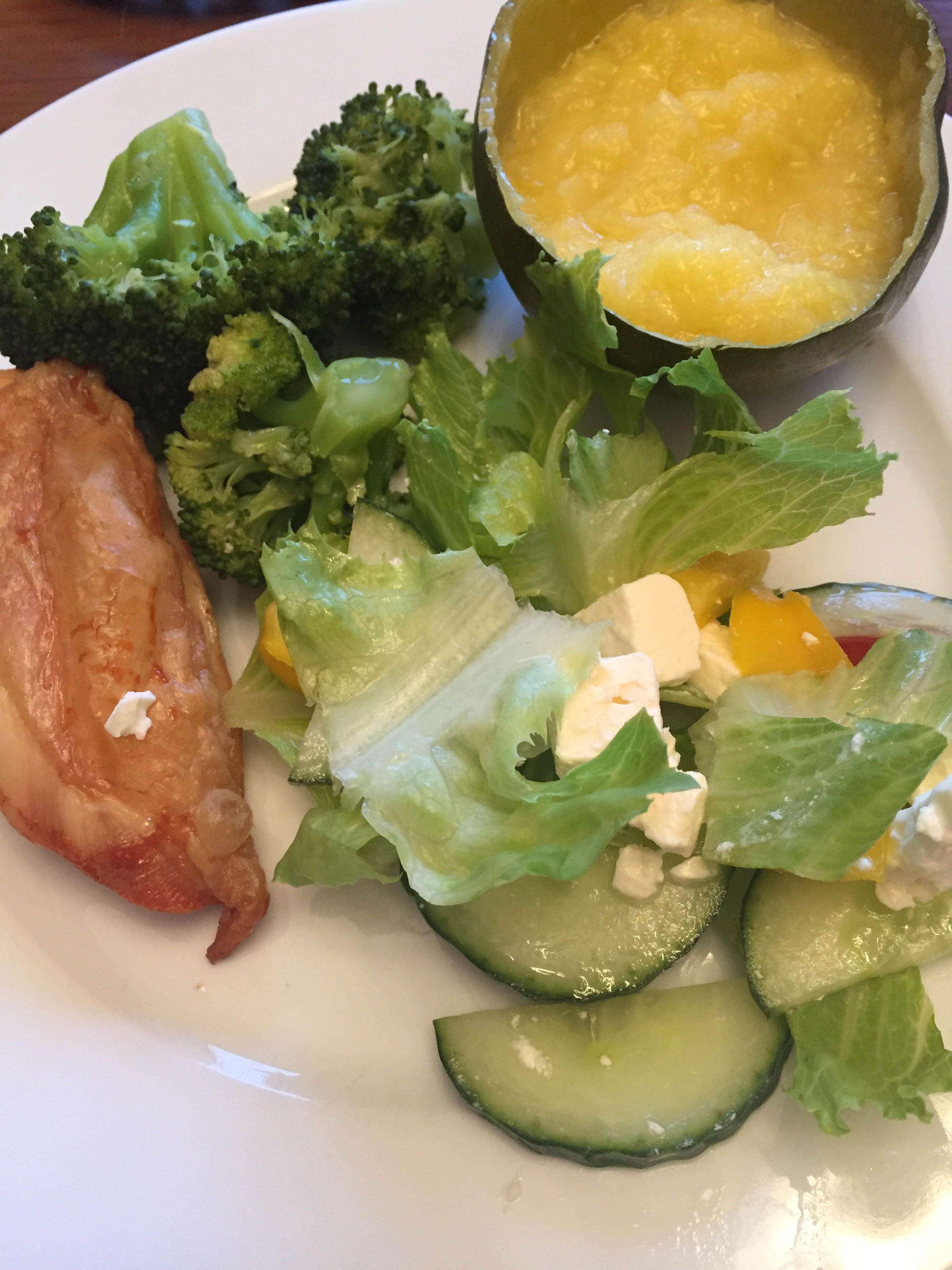 On Tuesday he baked chicken breasts with the skin on to add more fat and keep the chicken moist. He steamed gem squash and some mixed veg and made a salad.