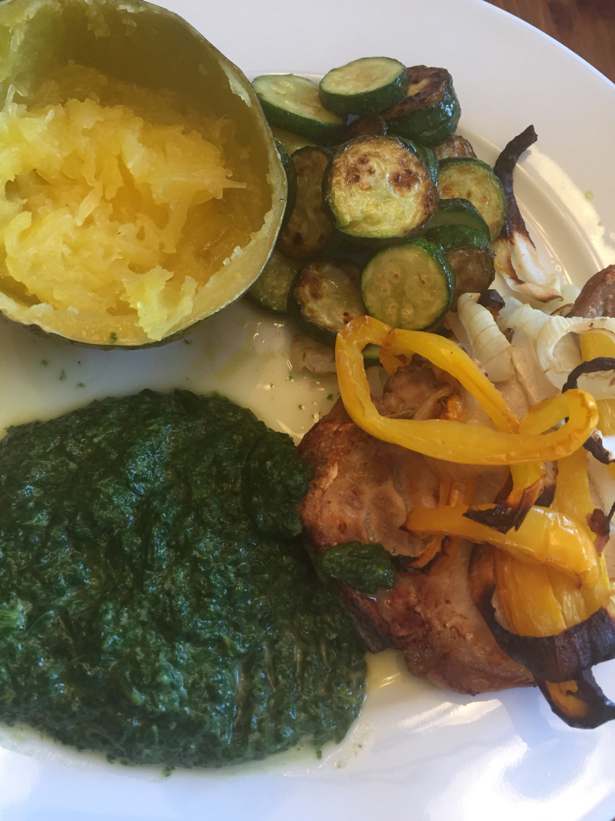 On Wednesday Josh came back down to Cape Town and Norm baked pork chops and to go with it he cooked the remaining gem squash and fried some baby zucchini. Norm also made a cheesy spinach dish which is one of my faves.