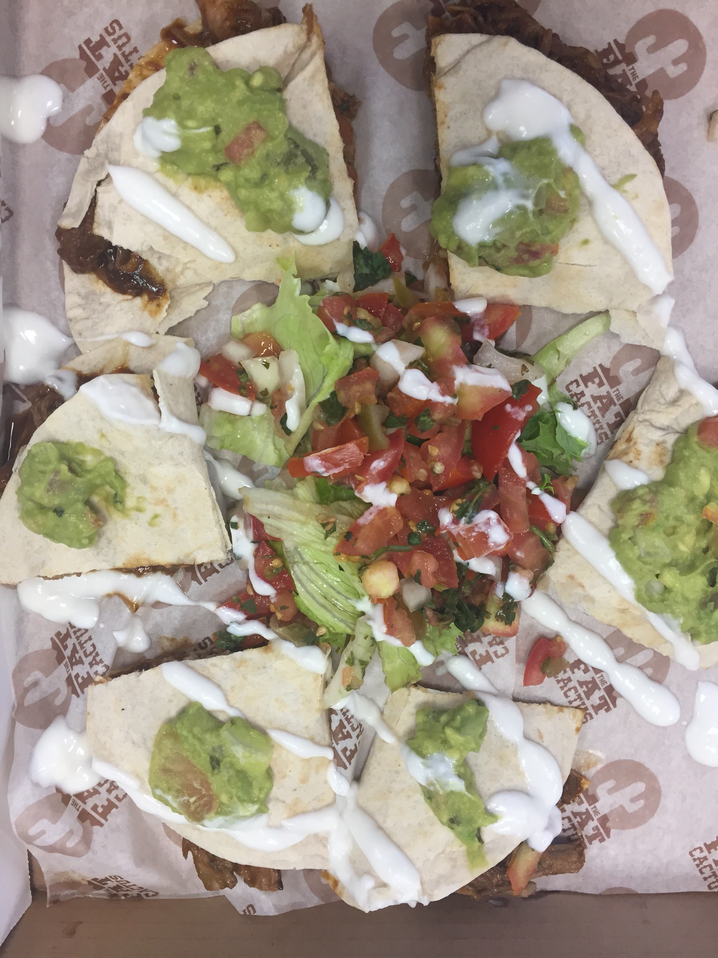 I chose the pulled pork quesadilla called the Happy Hog. It arrives in a pizza box so it was relatively intact on arrival. It normally comes with pineapple salsa but I always ask them to substitute normal salsa.