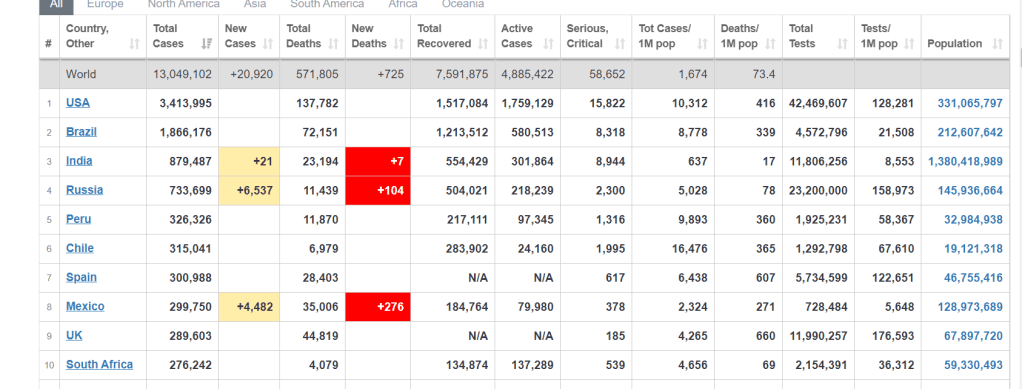I checked the stats today and South Africa is now number 5 for counts of positive cases in the world. If you sort the figures by deaths per million we move down to 45th now.