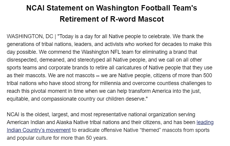 I mentioned in my last blog that after much pressure the Washington Redskins were reviewing the name of their football team. The NCAI published a statement on the decision to remove the offensive name from the team. The football team will remove the logo and ‘retire’ the name.
