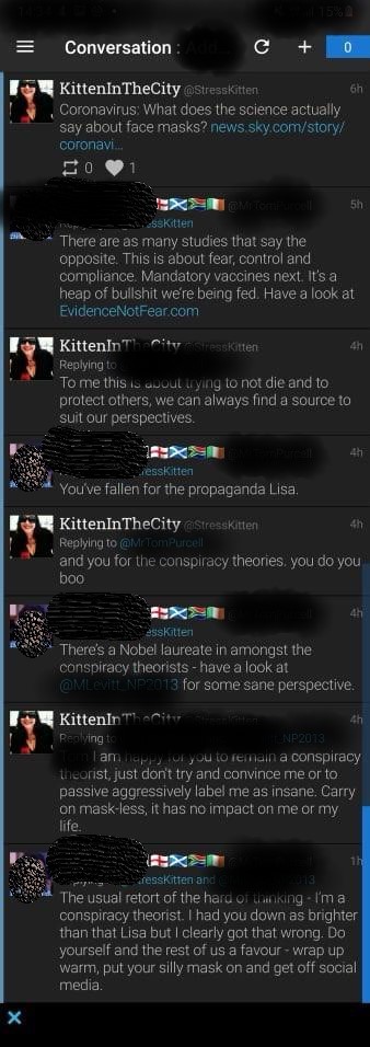 Then a guy whom I have known since we moved to Hout Bay replied to what I thought was a relatively innocent tweet of an article from Sky News about the science supporting the need to wear a mask. He started out trying to convince me that I was being brainwashed or controlled then when I did not buy into that argument he started getting passive aggressive and when I then called him out on that behaviour he blocked me.