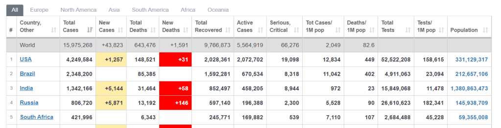 South Africa is now 5th worldwide for number of infections but luckily we are only 38th in deaths per 1 million so I guess that is a good thing, however any death is one too many.