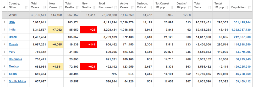 On a worldwide basis, SA is now dropped to 9th. Last week we were at 8th, week before that we were 7th (and the week prior to that we were at the number 6 spot). We have finally shifted on the count of deaths per 1 million and this week we have moved down to 28th after holding steady at 27th place for weeks. This shows the entire country is moving in the right direction.