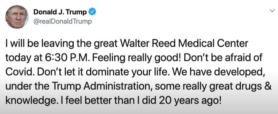 Later he checked himself out of the hospital despite warnings from his medical team that he may still be at risk. He then staged a photo op on the White House steps, then walked in without a mask, came back outside and did it again just to get better film footage. All of this while he is supposed to be quarantined.