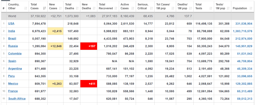 The USA is first in overall number of deaths worldwide with 218,648 people having lost their lives. Despite having just 4% of the world’s population, the U.S. is also first in total infections with 7,894,478 million confirmed cases (nearly 21% of global cases).