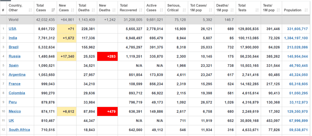 The USA is still 1st for total cases and total deaths, the highest numbers in the world. They are 10th for the count of deaths per 1 million people.