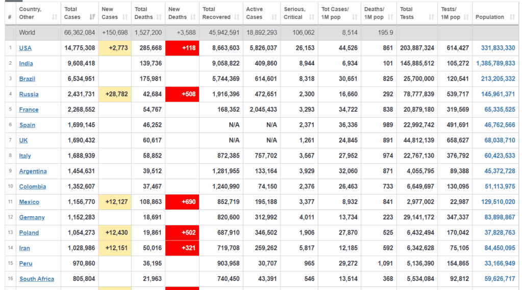 The USA is still 1st in total cases and there have been 285,668 deaths. Trump is not even attending the task force meetings and is doing all he can to obstruct Biden from putting anything in place to manage the virus. I cannot wait until January when the orange terror is gone and Biden can move forward with trying to get on top of this issue.