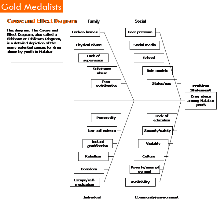 The fish bone diagram below is from a case study specific to youth in a particular area but it can be applied to anywhere in the world. The causes or influencers are the ‘bones’ and the ‘effect/result’ is drug abuse.