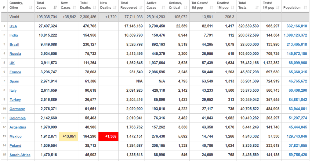 The US has had 470,705 total deaths and is 9th place in count of deaths per 1 million population. The UK is still in 5th place and has had 111,264 deaths. Their stats should now improve quite drastically as the vaccines are rolled out. The UK has been very successful and the NHS vaccinated a total of 10,021,471 million people between 8 December 2020 and 2 February 2021 which is amazing. The success in the US is very varied as it is being rolled out at a state level with different quantities of the vaccine being available per state and different systems being used to manage the appointment process, it is a mess in some places and very smoothly done in others.