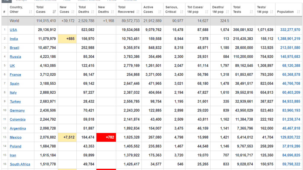 On a global ranking of total cases of Covid, South Africa is at 16th, the UK is 5th and the USA is still first.