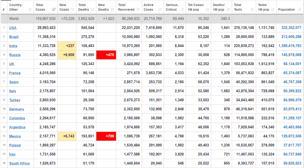 The UK is still 5th with 4,248,286 total cases and the USA is still 1st with 29,993,423 total cases. On a global scale of total deaths, the USA is still 1st with 545,544 lives lost and the UK is 5th with 125,343.