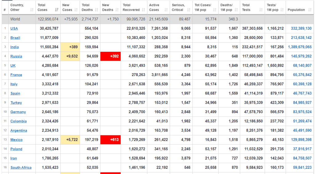 For the leveled out comparison of total deaths per 1million people, SA is 44th with 870 deaths in a million, the UK is 8th with 1,849 and the USA is 12th with 1,667 deaths.
