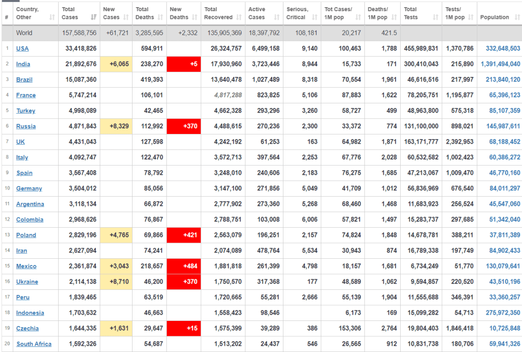 Now for the weekly update on Covid. For total cases, SA is 20th with 1,592,326 cases, the UK is 7th with 4,431,043 cases and the USA is still 1st with 33,418,826.