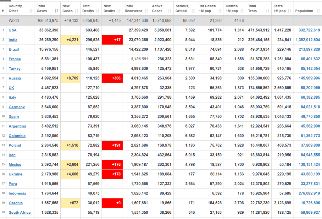 Now for my weekly Covid stats. On a global comparison of total cases there has been no shift for the 3 countries I track: SA is still ranked 20th with 1,628,335 cases, the UK is still 7th with 4,457,923 and the USA is still 1st with 33,862,398 total cases.