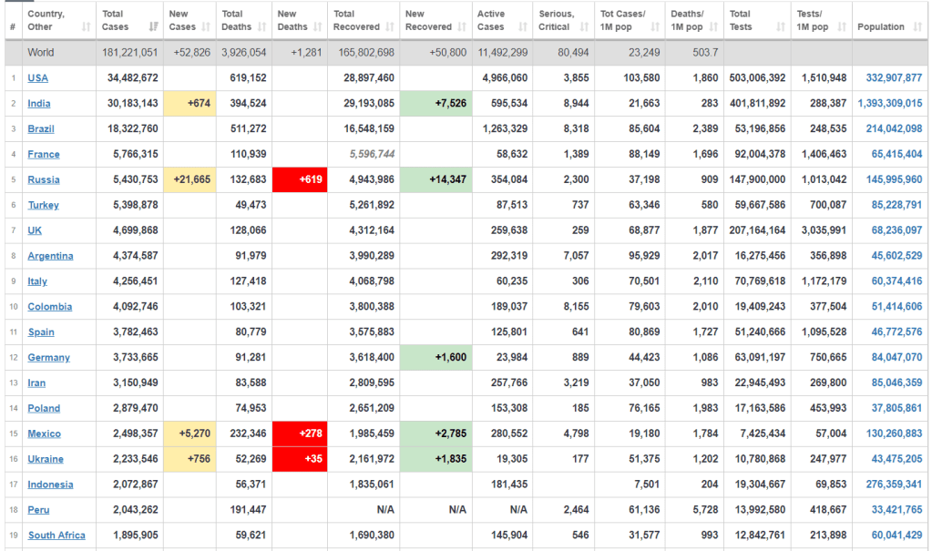 Now for my weekly COVID tracking stats for South Africa, the UK and USA (my 3 ‘home’ countries). In the ranking of total cases, none have changed their spot, SA is still 19th with 1,895,905 total cases, the UK is still 7th with 4,699,868 and the USA has recorded 34,482,672 cases, a number which is unfathomable if you think about it.