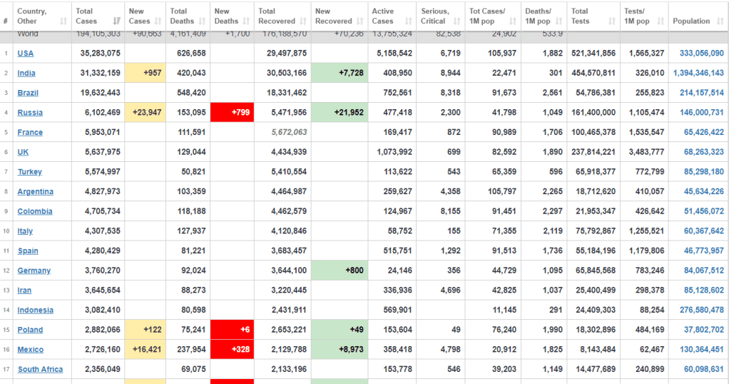 COVID-19 is affecting 220 countries and territories. The global ranking is that the US has remained in 1st place with 35,283,075 total cases, SA is still 17th with 2,356,049 cases, but the UK has moved up a place to 6th with 5,637,975 cases. Despite this increase the UK has lifted lockdown restrictions this week. I hope it does not prove to be disastrous but the fluffy hair eejit Johnson has handled this poorly from the start.