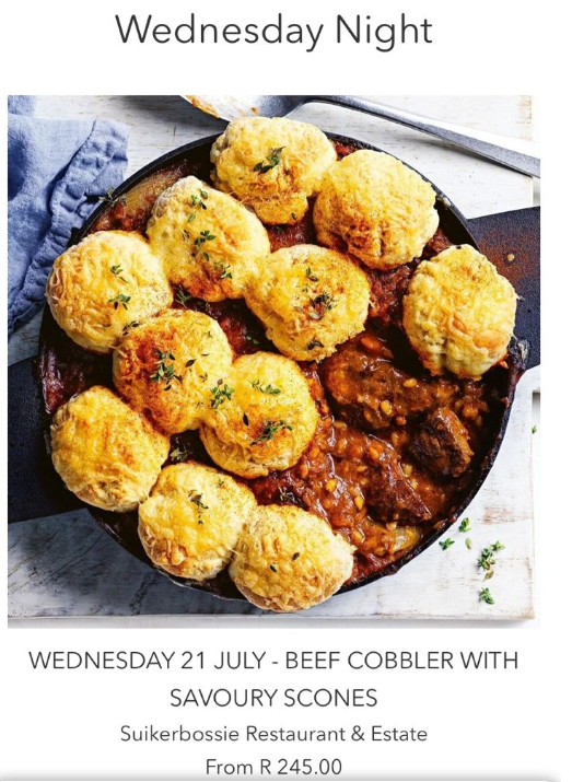 We have been supporting many restaurants during lockdown and this week we tried out the meals from Suikerbossie Restaurant. They have set up a specific service for lockdown. Each night they do a limited number of meals which you can choose for 2 or 4 people for a set price. We ordered the Beef cobbler with savoury scones.