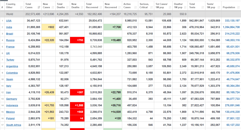The global ranking this week is that the US has remained in 1st place with 36,447,123 total cases, SA is still 17th with 2,511,178 cases, and the UK is still 6th with 6,014,023 cases.