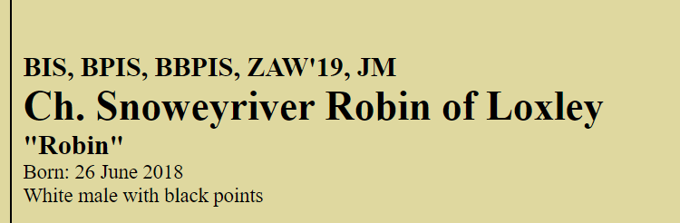 I’ve mentioned about all of the coincidences and signs that Finn is meant to be ours. This week the breeder sent me a link to a site which has a gorgeous pic of Daddy Dog Robin of Loxley who has just won another show and I saw that he was born on my Mom’s birthday! Another little sign.