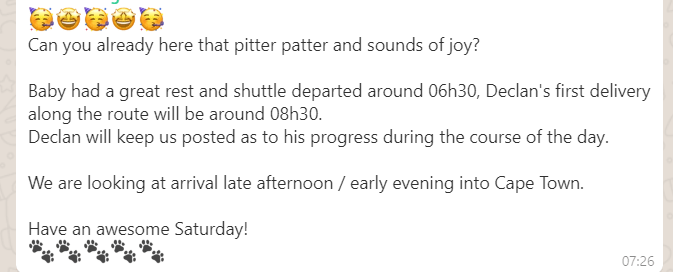 Today is a very special day. We collect our Finn later this afternoon. The breeder used Pets Travel, and the company has been absolutely amazing. They have set up a WhatsApp group with me, the drivers and the agent and they have been sending me updates throughout the journey.