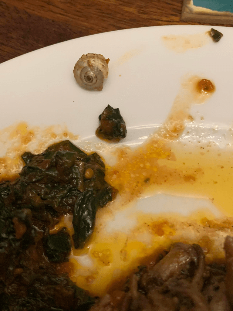 Then on Saturday night we ordered a take-away from a local venue. I will not give their name as I had a chat with a very repentant manager who wanted to provide me with an alternative meal but I was not hungry after this incident. Basically as I was chowing through my healthy spinach side dish I felt something crunch and thought it might be a bit of grit, however in my next forkful I spotted a snail. Not just a tiny little spot of slime but an entire snail with his shell still intact.