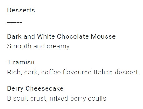 For dessert I chose the Dark and White Chocolate Mousse. It was incredibly rich and could have benefited from some crunch to break up the richness and add a bit of texture, I was hoping there might be some crumbled biscuits in the base of the glass but alas, nada. I give this 2.5 Kitten Stars, it was also nothing special.