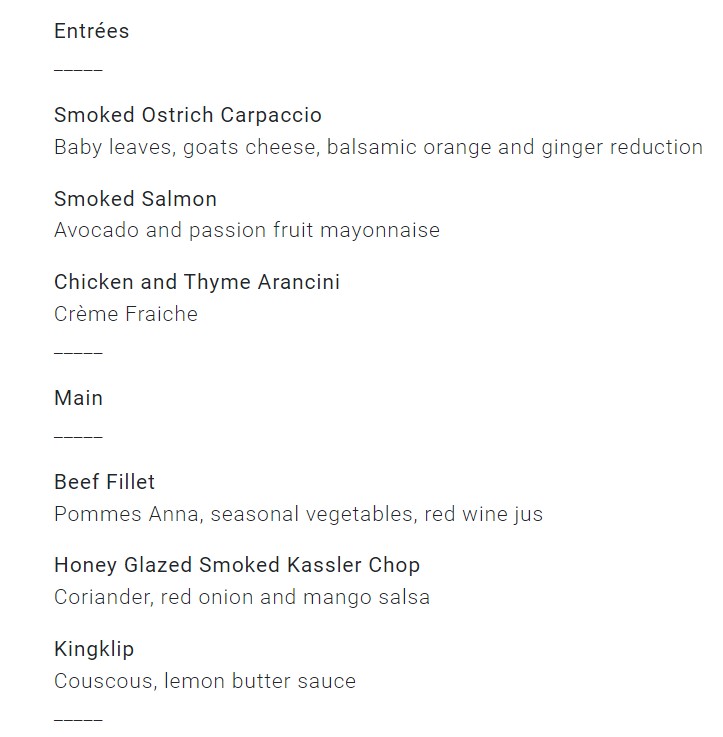 We were presented with a drinks menu and I ordered a Cosmopolitan and Norm ordered a glass of wine and we had a look at the food menu. There was a 3-course dinner menu for R295.