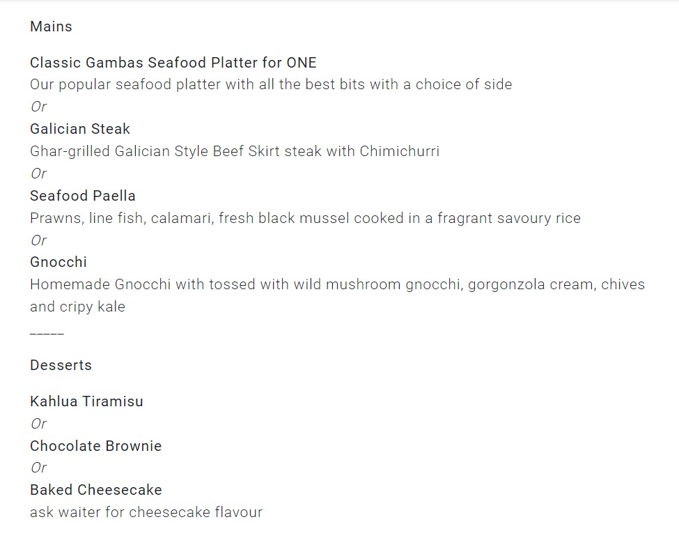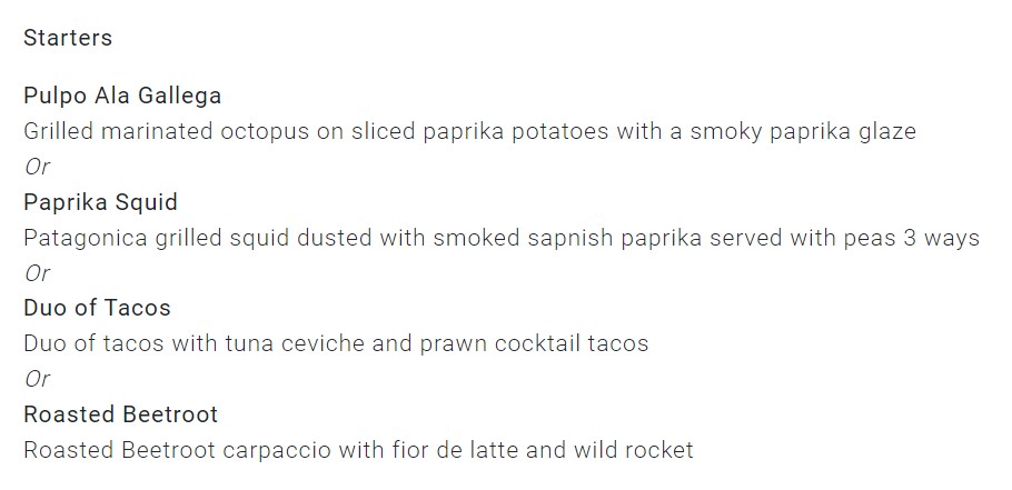 The menu sounded yummy and I was really looking forward to it (once I remembered that we were going). We had booked for a Spanish 3-course dinner menu for R255 each.